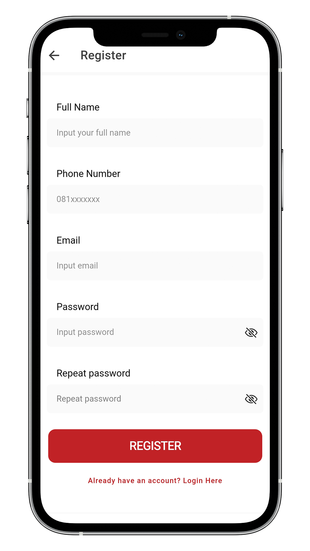 Register by entering your Full Name, Email, Indonesia Local Phone Numbers (+62) and Password.